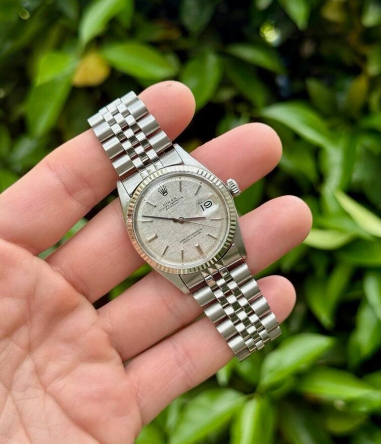 Chcę sprzedać ten zegarek Datejust 1601 ze stali nierdzewnej z białą tarczą z lnu Jubilee 36 mmSeria: Oyster Perpetual